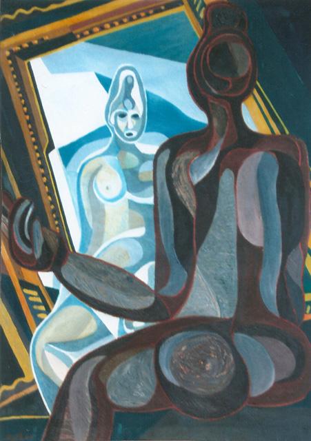La composición presenta un diálogo entre figura y reflejo, donde la identidad se desdobla en una escena cargada de tensión poética. El uso predominante de los tonos azules no solo define el espacio, sino que sugiere profundidad emocional y silencio, elementos característicos de esta etapa. Las formas, aparentemente reconocibles, se transforman en símbolos que invitan a una lectura más espiritual que descriptiva.