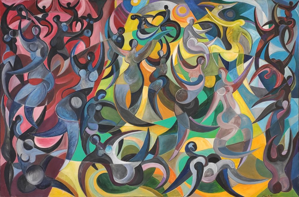 En Discoteca, obra perteneciente a su etapa subjetiva, el artista plasma la energía vibrante y el dinamismo del espacio nocturno a través de una composición intensa y envolvente##. Las figuras humanas se transforman en siluetas sinuosas y fragmentadas que se entrelazan en un movimiento continuo, casi coreográfico.