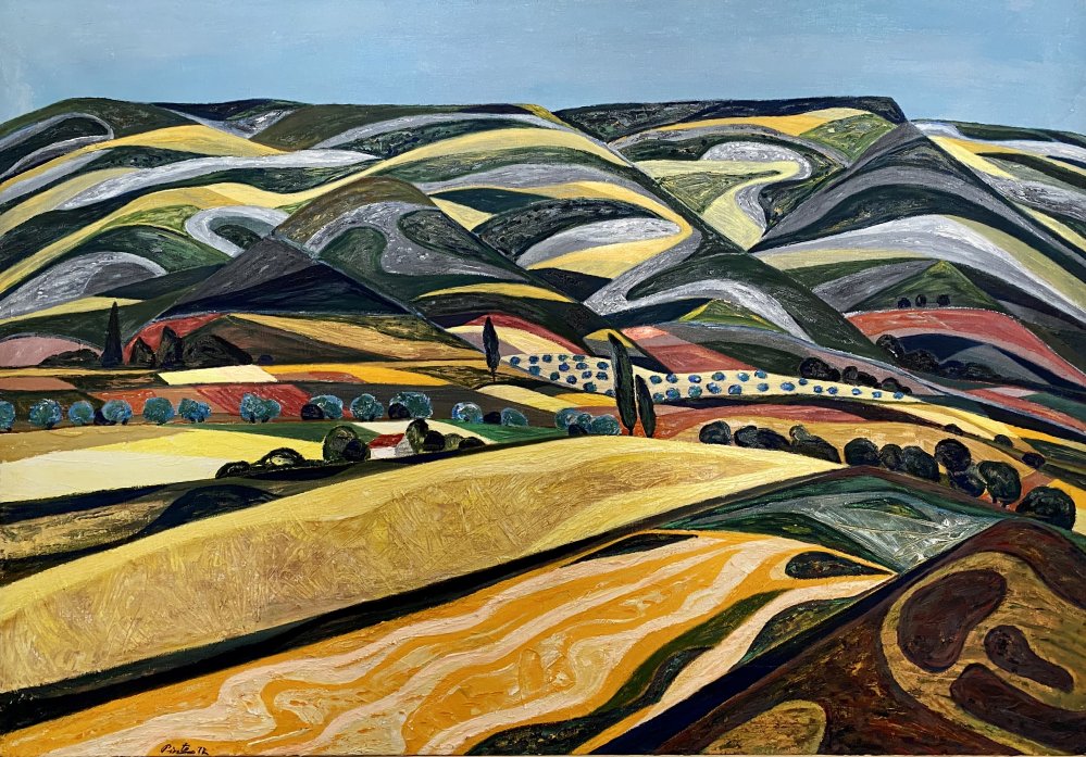 La composición se construye mediante formas delimitadas y una ordenación casi geométrica del territorio. Las suaves ondulaciones de los montes generan profundidad y continuidad visual, mientras los caminos serpenteantes articulan el recorrido de la mirada a través del cuadro. Los árboles, estilizados y rítmicamente dispuestos, aportan equilibrio y refuerzan la estructura del conjunto. Aunque el paisaje es reconocible, Miguel Pinto lo somete a una interpretación personal, donde la realidad se ordena bajo criterios plásticos propios.