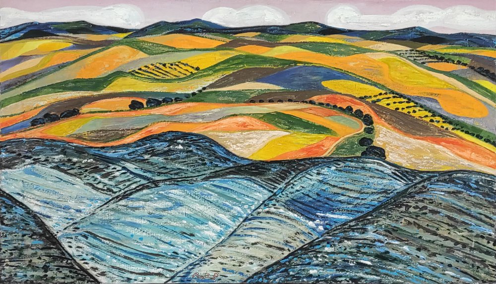 El cielo, contenido y sereno, actúa como un testigo mudo de este contraste, sin intervenir, dejando que sean los colores de la tierra los que narren la historia. Así, “Contraste” es mucho más que una vista paisajística: es una topografía emocional, una meditación plástica sobre el territorio natal, donde cada trazo, cada surco, cada color, está cargado de memoria, identidad y sensibilidad.