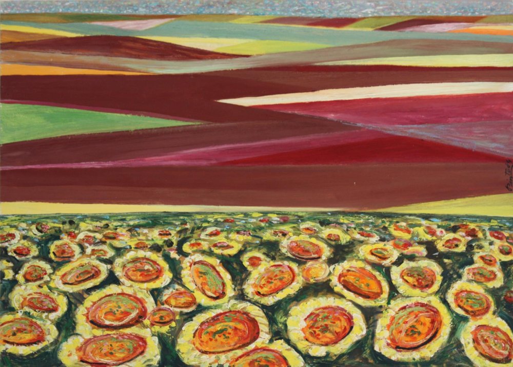Esta obra que fue concebida como un estudio preliminar, un apunte en el que el artista exploró la composición, el uso del color y la técnica antes de trasladar su visión a un lienzo definitivo. El oleo sobre lienzo fue creado en 1991 con una medida 81x100cm, titulado también “Campo de Girasoles”.