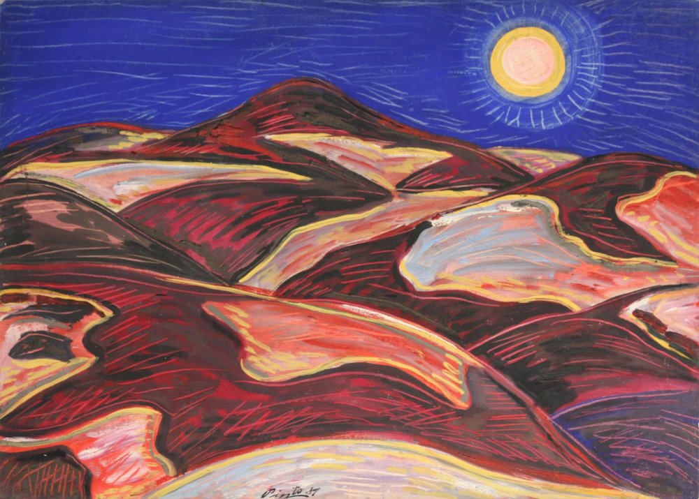 El uso del color es clave en la carga emocional de la obra. Los tonos cálidos de la tierra contrastan con el azul profundo del cielo nocturno, creando una atmósfera cargada de energía. La luna, representada con círculos concéntricos de colores cálidos, no solo ilumina el paisaje, sino que parece expandirse, envolviendo toda la composición en su resplandor. Miguel Pinto no busca el realismo, sino una representación poética de la noche.