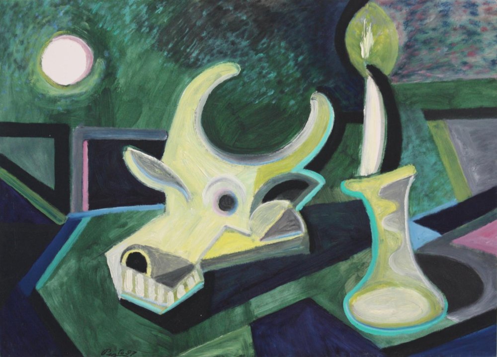En Osamenta, Miguel Pinto compone una naturaleza muerta simbólica con una calavera de toro como protagonista, acompañada de una vela encendida y un jarrón sobre un fondo nocturno de verdes profundos##. La calavera, estilizada en amarillos pálidos y formas geométricas angulares, domina el centro con su cuerno curvado y cuencas vacías, evocando la muerte inevitable y la fugacidad de la vida.
