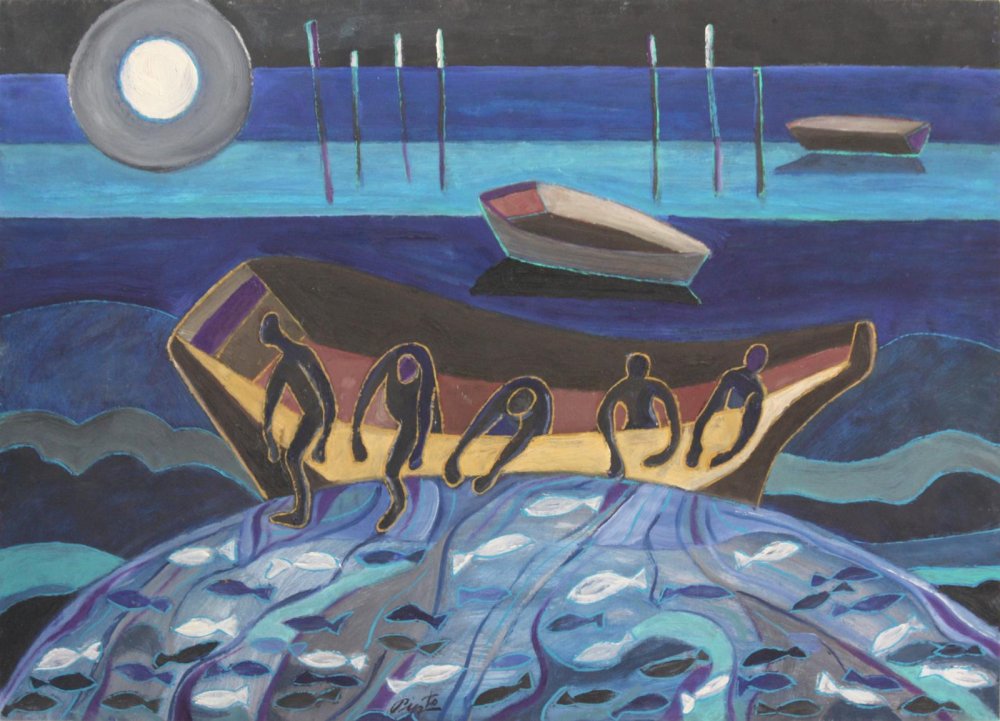 La obra evoca la dureza y la belleza del trabajo en el mar, utilizando un lenguaje visual que combina lo figurativo con lo simbólico##. La fuerza del color y el dinamismo de las formas hacen de esta pieza un ejemplo del estilo único de Miguel Pinto, donde la emoción y la estética se fusionan para crear una escena de gran impacto visual.