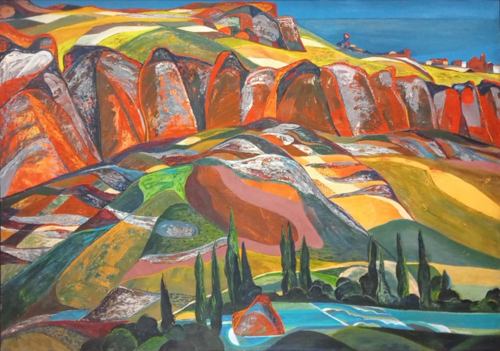 Las formaciones rocosas en la parte superior de la obra están representadas con tonos rojizos y ocres, resaltando la fuerza del terreno. Pinto emplea contrastes de color y planos definidos para dar volumen y textura a las rocas, utilizando sombras azuladas y violáceas que aportan profundidad. La disposición de las montañas genera un efecto de dinamismo, casi como si el paisaje tuviera vida propia, una característica recurrente en la obra del artista, quien buscaba transformar sus paisajes en una "topografía de emociones".