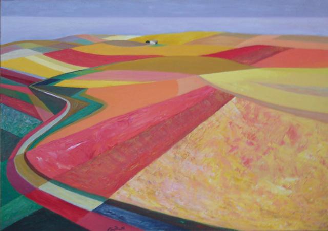 En esta obra, Miguel Pinto lleva su lenguaje pictórico hacia un nivel de abstracción geométrica y cromática que trasciende la representación tradicional del paisaje##. El territorio ya no se ofrece como vista reconocible, sino como una superficie ordenada por el color, por la luz, y por la intervención humana. La obra es un homenaje visual al paisaje agrícola, donde cada parcela de tierra es tratada como un plano autónomo, dotado de identidad propia.