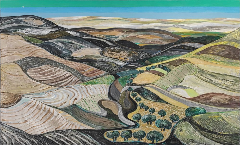 El lienzo está organizado en varios planos claramente diferenciados que guían la mirada del espectador desde el primer plano hacia la profundidad del paisaje. El primer plano presenta campos agrícolas con líneas curvas que aportan dinamismo y generan una percepción rítmica y ondulante. Un segundo plano intermedio destaca por la presencia de una masa arbórea oscura, que actúa como punto de equilibrio visual en la composición. Posteriormente, planos intermedios superiores sugieren colinas y elevaciones suaves que conducen hacia un fondo más difuminado, en el que la perspectiva atmosférica realza la distancia visual. Finalmente, el cielo constituye otro plano esencial, ofreciendo un espacio abierto y luminoso que contrasta con el terreno, aportando equilibrio y serenidad al conjunto.